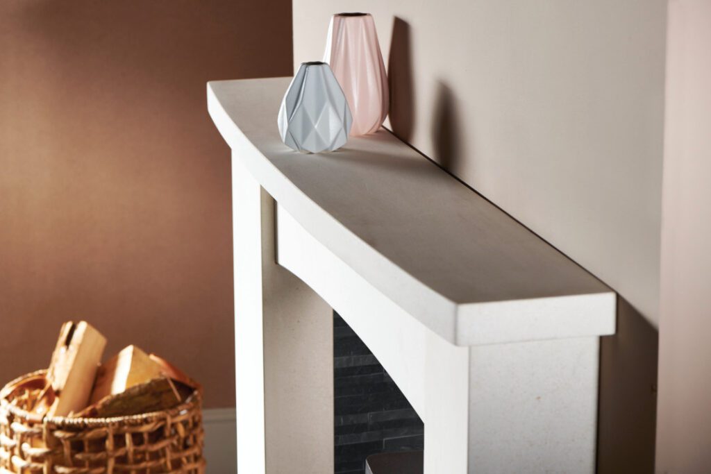 The Alban is pictured here in Aegean Limestone with a Riven Slate chamber and Scene Eco multi fuel stove, this beautiful mantel is also available in Corinthian Stone.