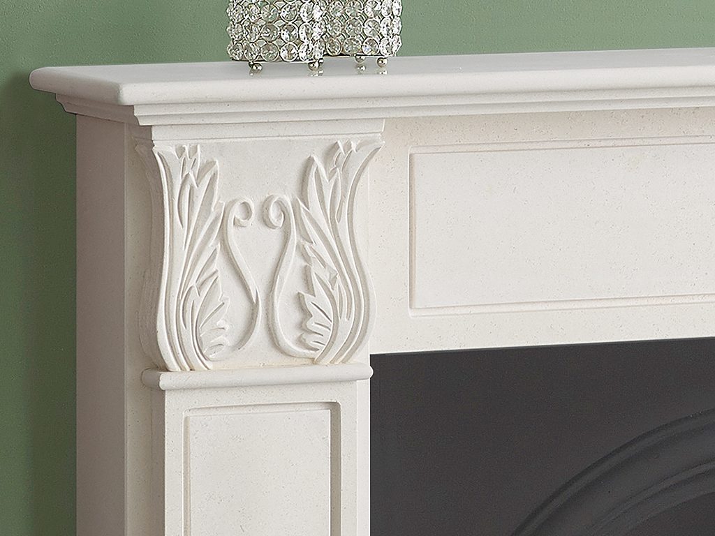 The Carisbrooke mantel is available in Aegean Limestone with a 59″ shelf width, it is perfect for rooms with a large chimney breast.
