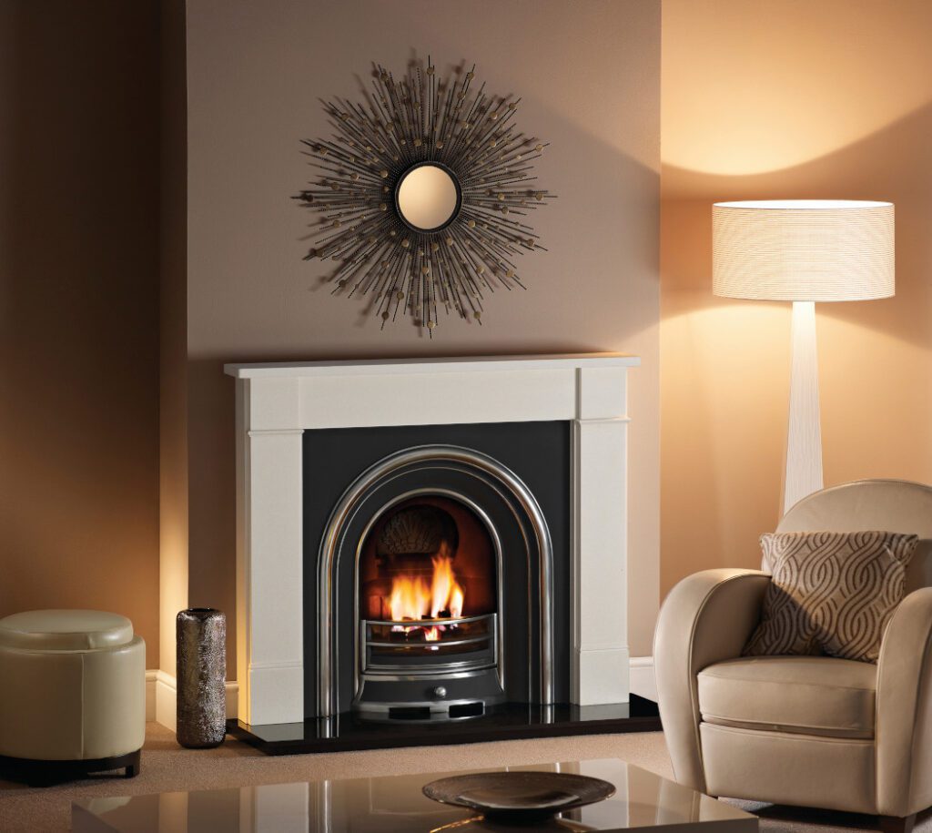 Pictured in Aegean Limestone with the Wandsworth Highlight Cast Insert, Decorative Gas Fire and Polished Granite Hearth. The Hersham in Aegean Limestone is available in sizes 48″, 51″, 54″ and 56″.