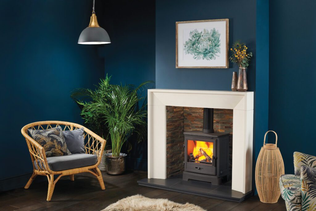 Pictured in Aegean Limestone with the Rusty Slate Chamber, Barrington Eco 2022 Stove with Baseline Legs and Honed Granite Hearth.