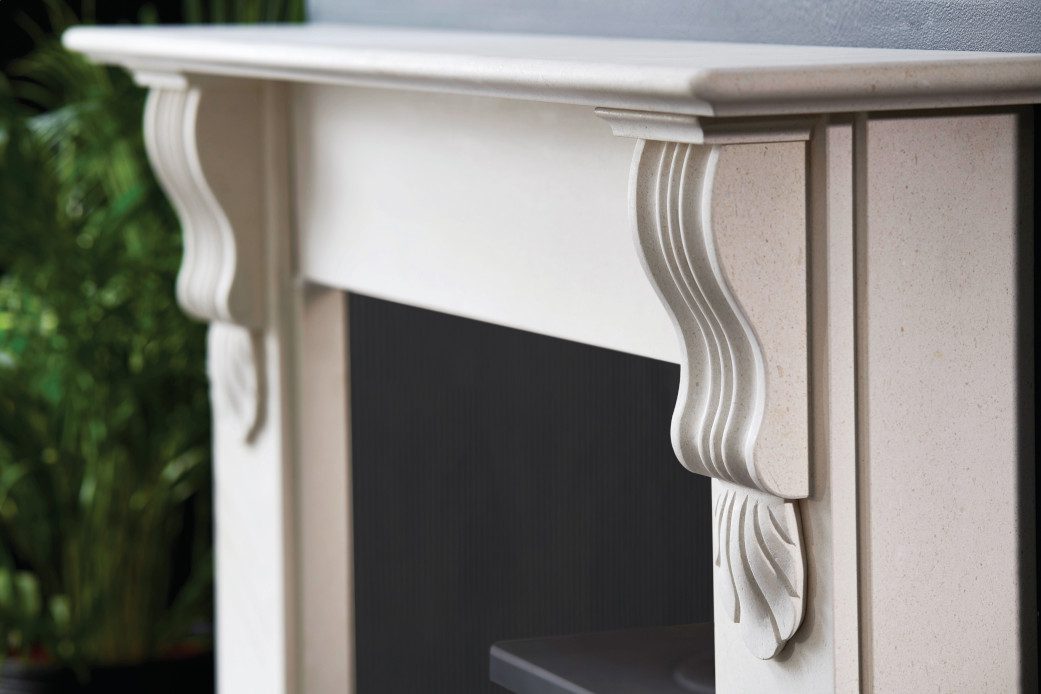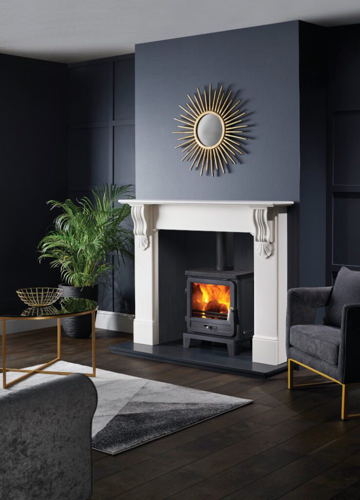 The Nuffield is available in Aegean Limestone, Carrara Marble and Liberty White, a versatile mantel that complements a range of different interior options as pictured here with a black reeded chamber and Vega Edge 200sl Eco stove.