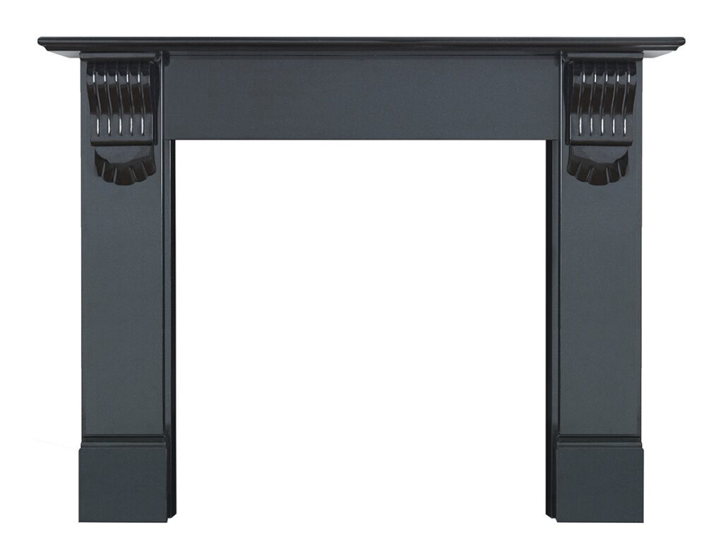 The Athena mantel is manufactured in black granite from the Shanxi region of China. The mantel displays quite contemporary hand crafted corbels against an otherwise simple design.
