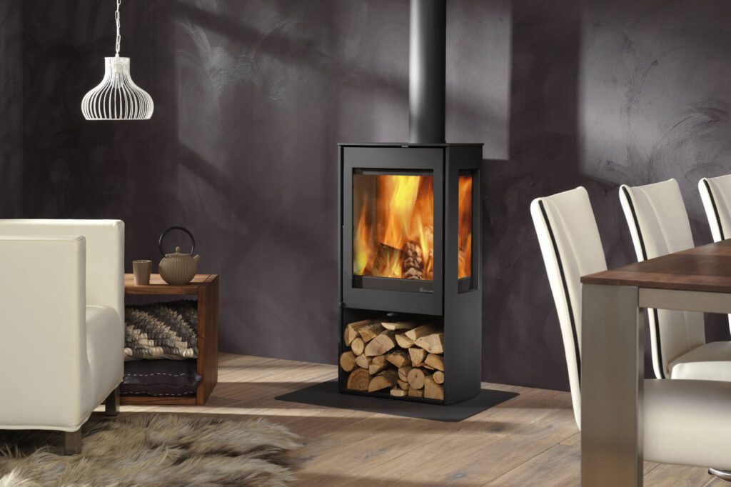 Kalle is an imposing 3-sided wood stove with tall, portrait shaped viewing windows that create a warm and comforting glow all around the room. It has an elegant anthracite finish, with a generous heat output of 4 kW and an impressive energy efficiency of 85%. In addition, there is substantial log storage space underneath.