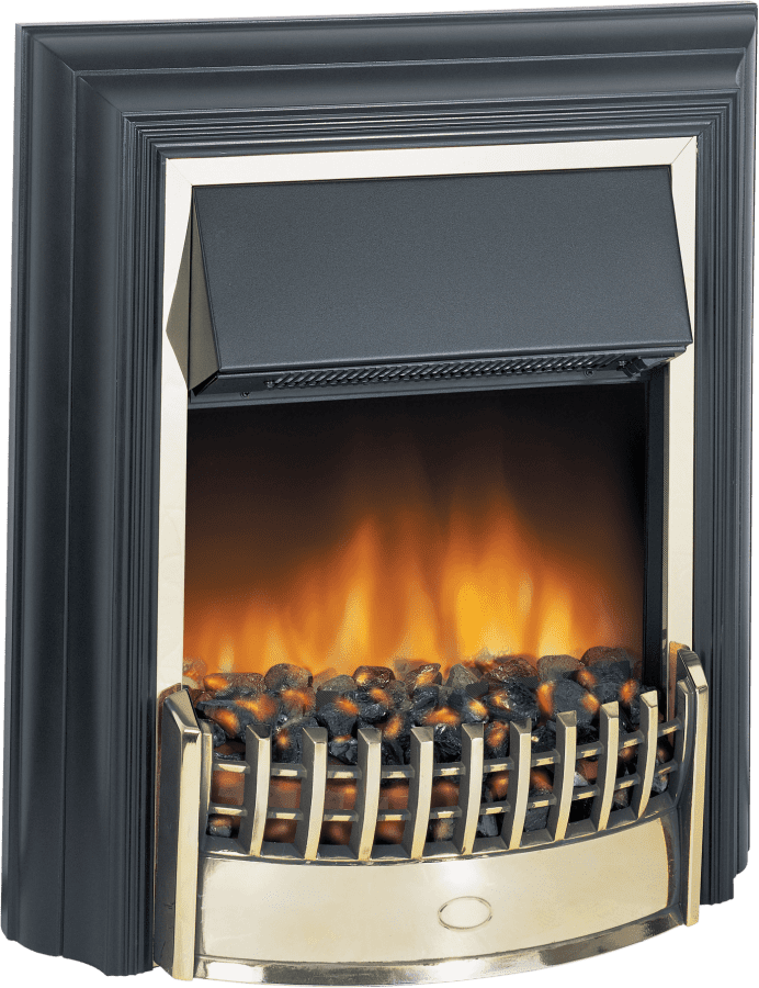 Freestanding fire with Optiflame effect and real coals. Designed to fit “flat-to-wall”. Black and brass-effect finish.