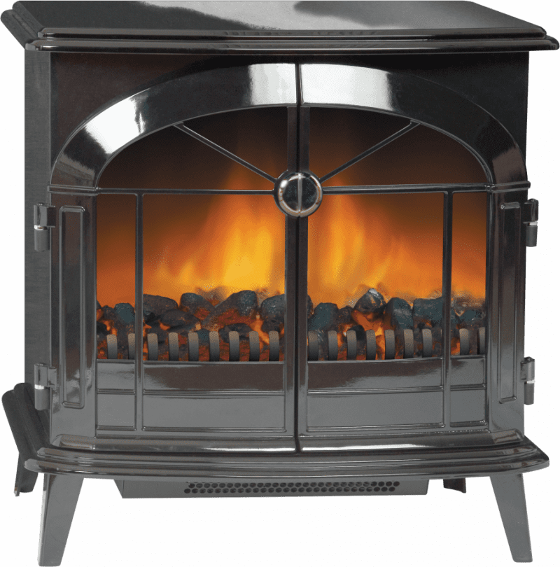 Cast-iron style stove with Optiflame effect. Black gloss finish. Supplied with real coal and log effect.