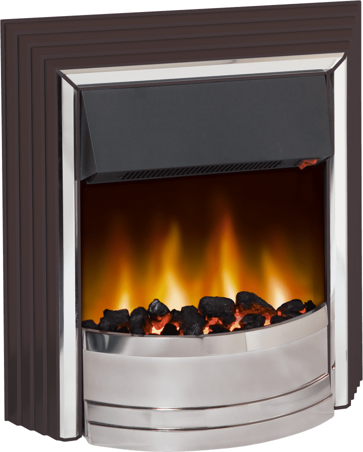 Freestanding fire with Optiflame effect and real coals. Designed to fit “flat-to-wall”. Black and chrome effect finish.