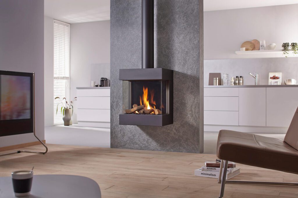 DRU Diablo Next is a classic, 3-sided suspended gas fire in alu-metallic or black. It is mounted directly onto an outside facing wall, with no chimneybreast. This allows for quick and easy installation and it takes up less space. The flue from the top of the fire can be concealed behind a matching flue cover.