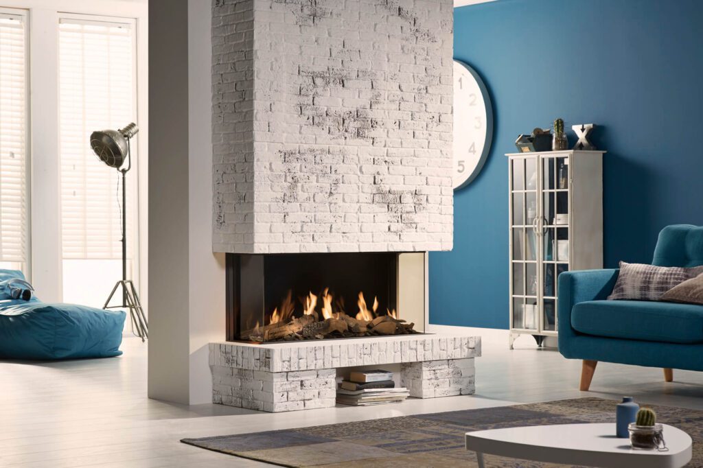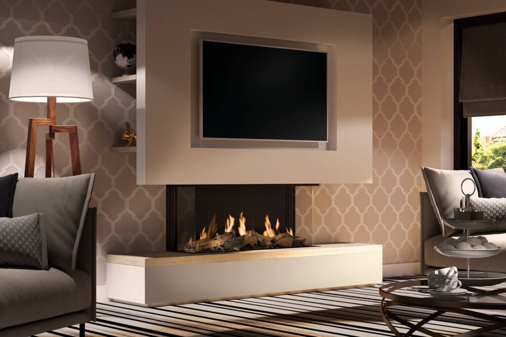 Global 100 BF Triple is a classic 1 metre wide gas fire with a 3-sided window that can be viewed from all angles. It has log, stone or anthracite glass fire displays and energy efficiency of 94%. The interior available in a choice of black or mirrored Ceraglass and it has a generous 7.5 kW heat output.