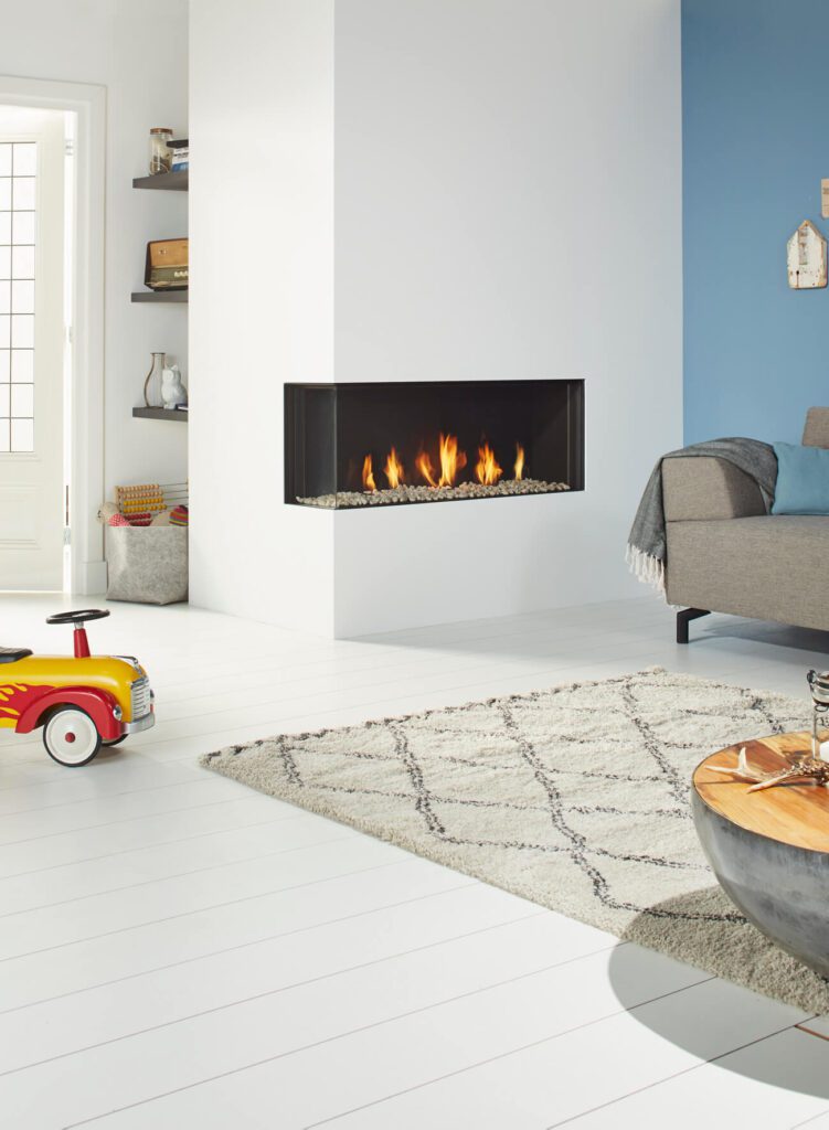 Global 120 Corner BF is a classic contemporary 1.2 metre wide gas fire with a return section that gives it an added dimension. It features inspiring log, stone or anthracite glass fire displays and energy efficiency of 88%.Its expansive glass window lends itself to a variety of locations, such as room dividing walls and room features.