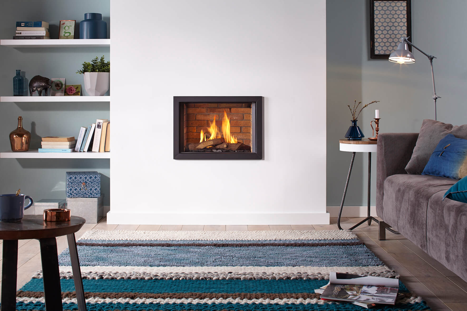 Global 55 CF is a modern log gas fire. It has a width of 55 cms (22”) and a narrow depth.There is a choice of Ceraglass, black or classic stone interiors.