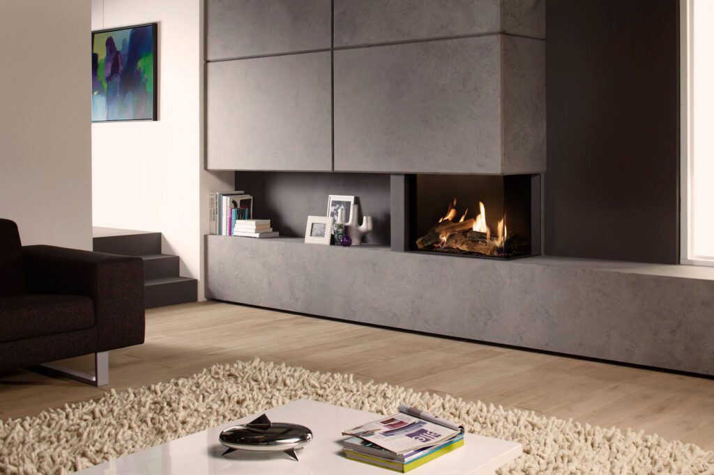 The DRU Lugo 80/2 Eco Wave gas fire is an 80 cms wide two-sided corner model, so the impressive log fire display can be viewed from different angles. No ventilation openings are visible within the frames and the window connects directly to the plinth for a smooth appearance. Interior finishes include matt black, ribbed cast or mirrored Ceraglass.