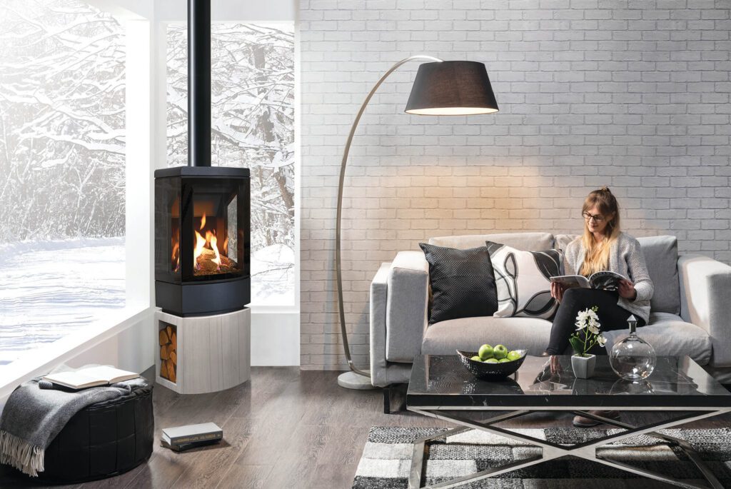 The Loft gas stove’s tall firebox is framed with reflective black glass, adding a striking two-tone contrast to the matt steel body. Soaring flames dance amongst a highly realistic fuel bed, composed of hand painted realistic logs. Visuals are mirrored on all sides by the EchoFlame Black glass lining – a continuation of the stove’s glossy exterior styling details.