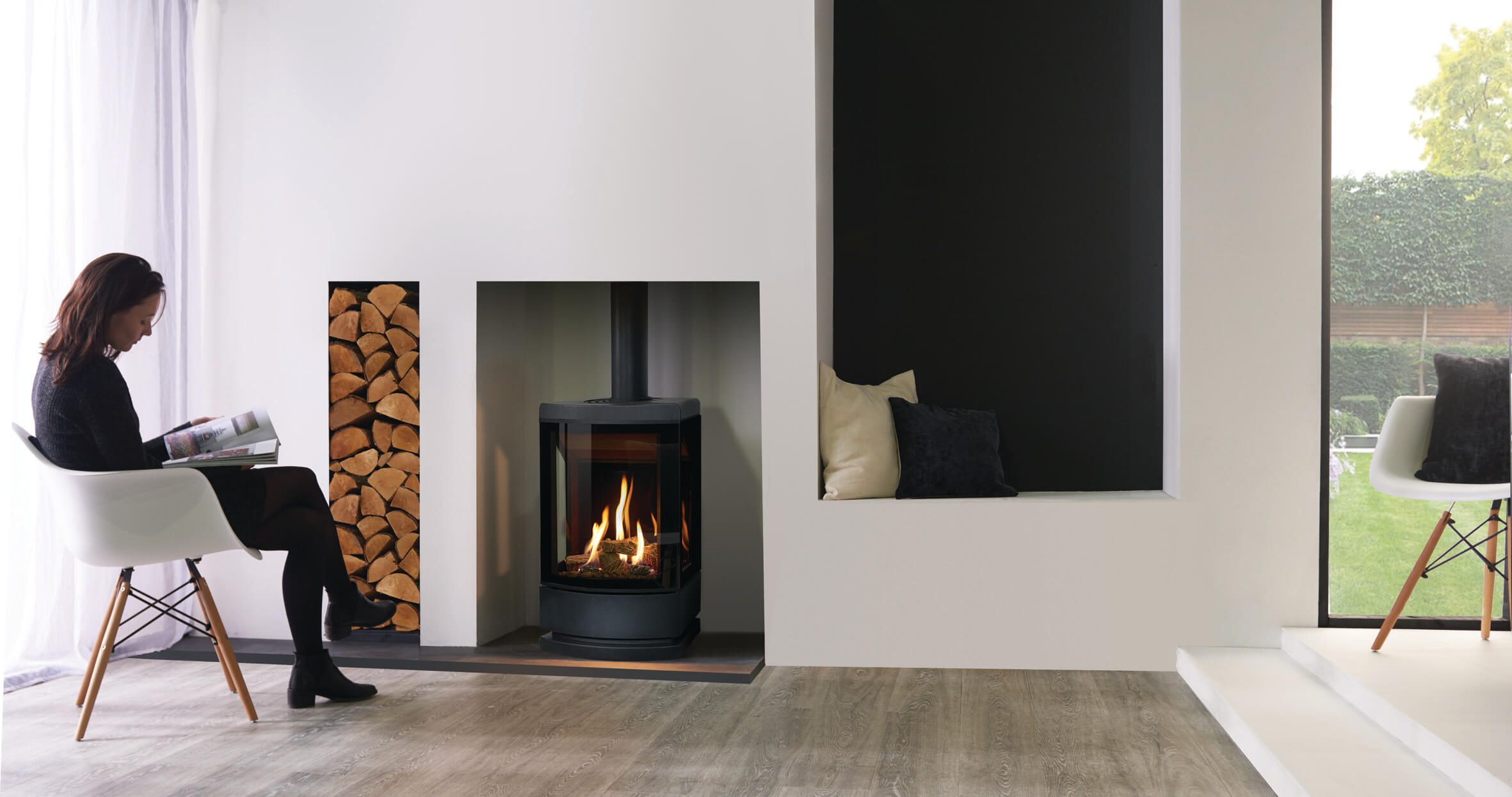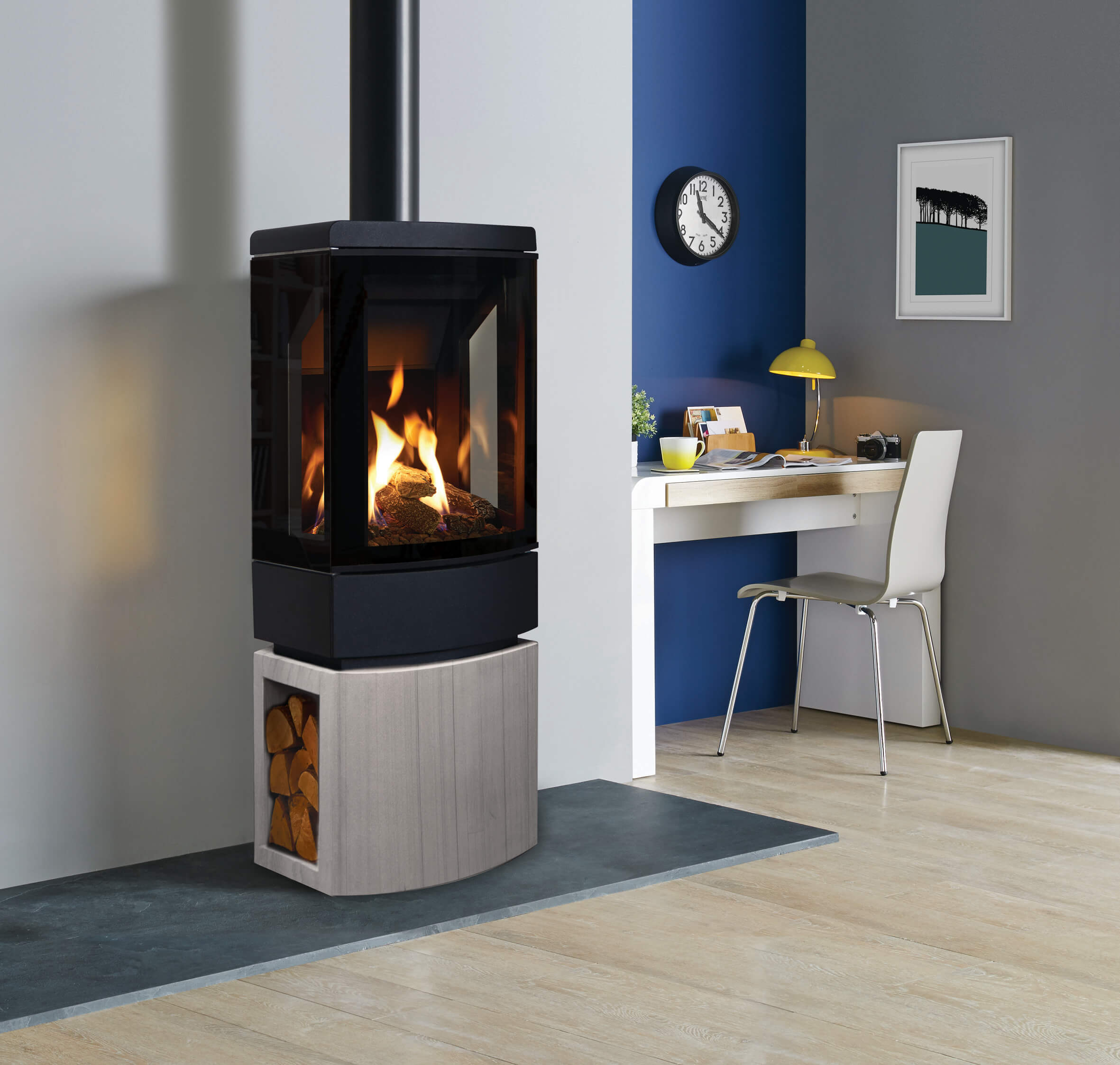 Loft stoves can be styled with a variety of accessories, offering a range of luxury options for your gas stove. You can choose to mount your stove on a range of cleanly styled Plinth and Logstore bases, with either option offered in matching steel, a smart Castillo grey sandstone or luxurious Woodgrain sandstone.