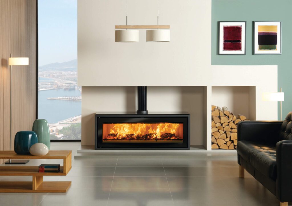 The largest in Stovax’s Studio range is the striking Studio 3 Freestanding Ecodesign wood burning stove. This highly efficient and visually impressive wood burning stove has the same 11kW of heat output and stunning widescreen views of the flames as its inset fire equivalent but offers a very different look.
