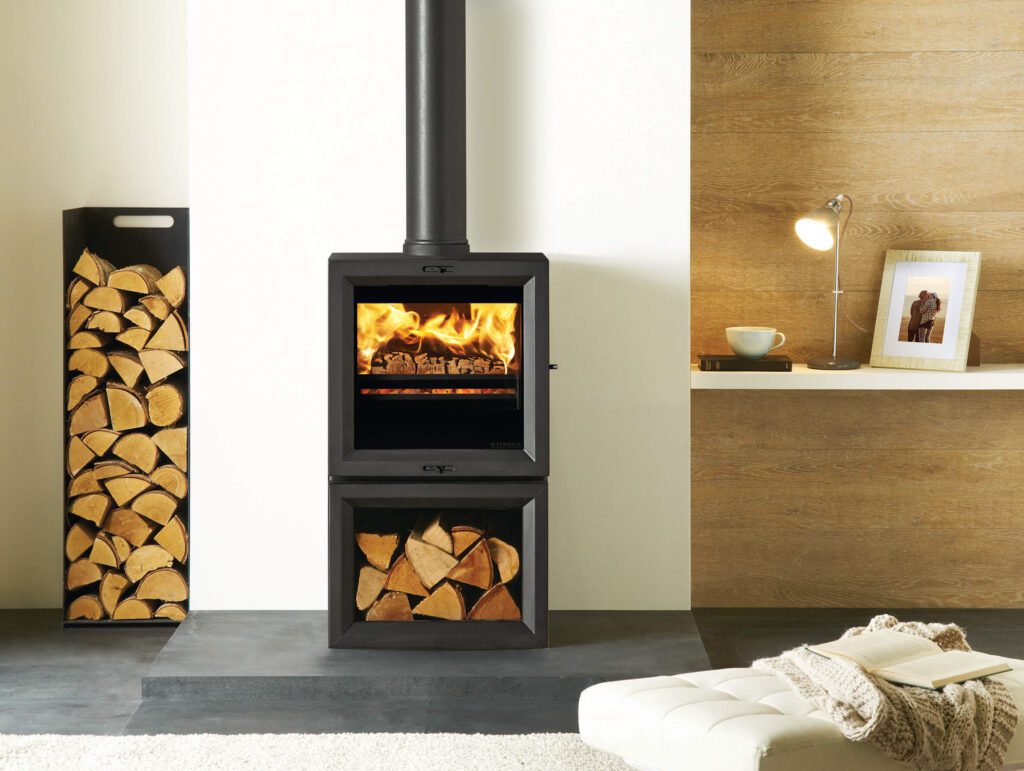 Elevating the sleek lines of the Stovax View 5 wood burning and multi-fuel stove, the View 5 Midline stove incorporates an integral log store into the design.