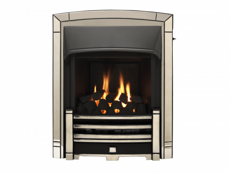 This slimline glass fronted inset fire provides the illusion of a full flame  – thanks to its reflective sides and realistic coal effect fuel bed – while retaining high energy efficiency. It’s the ideal choice when energy efficiency is a key priority within limited space, as less gas is wasted in escaping the fire. It also offers radiant heat,  meaning you feel heat directly from the fire.