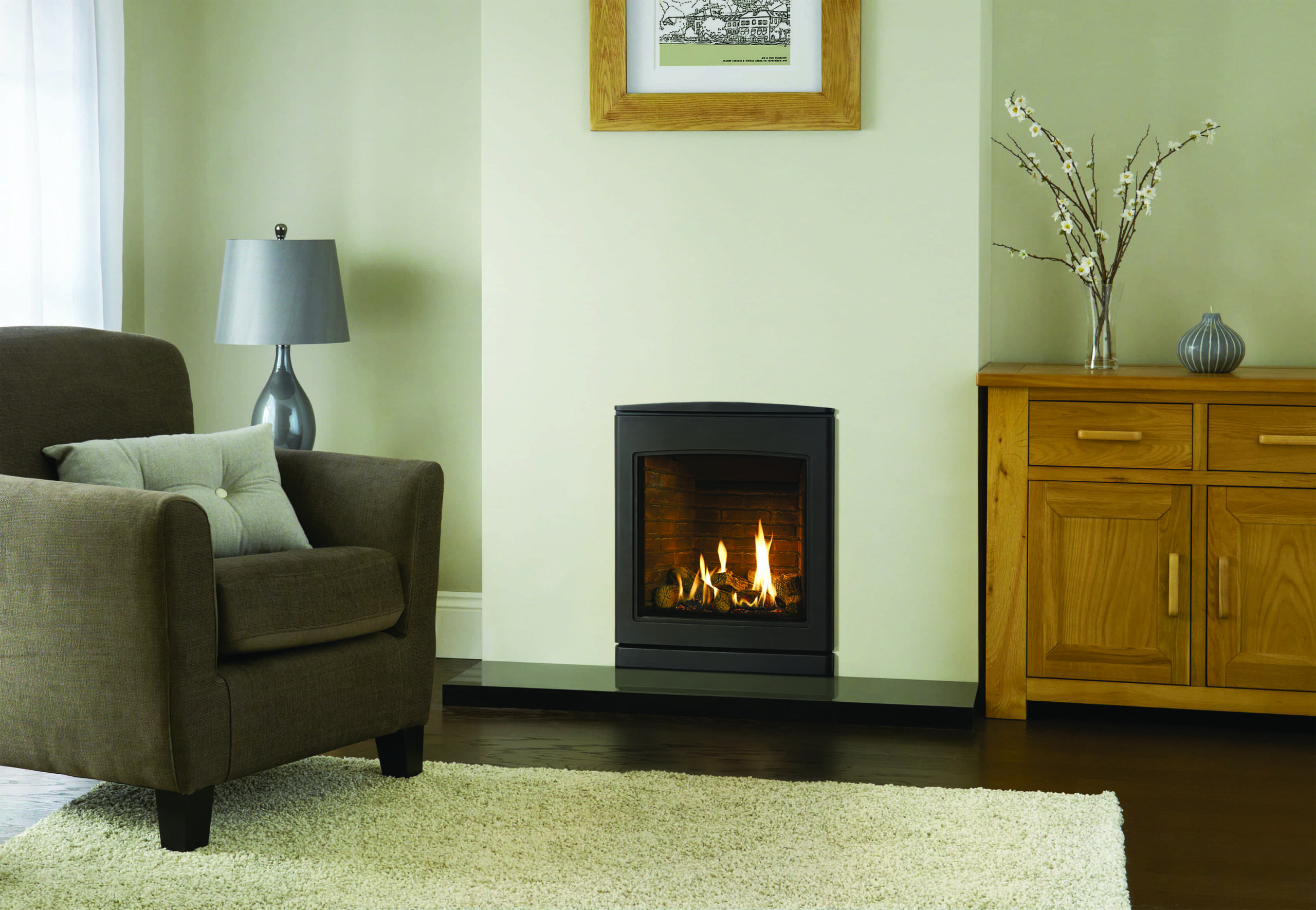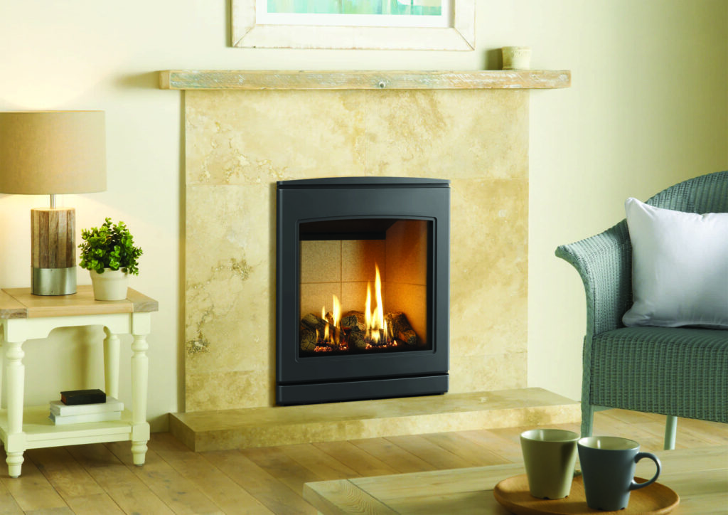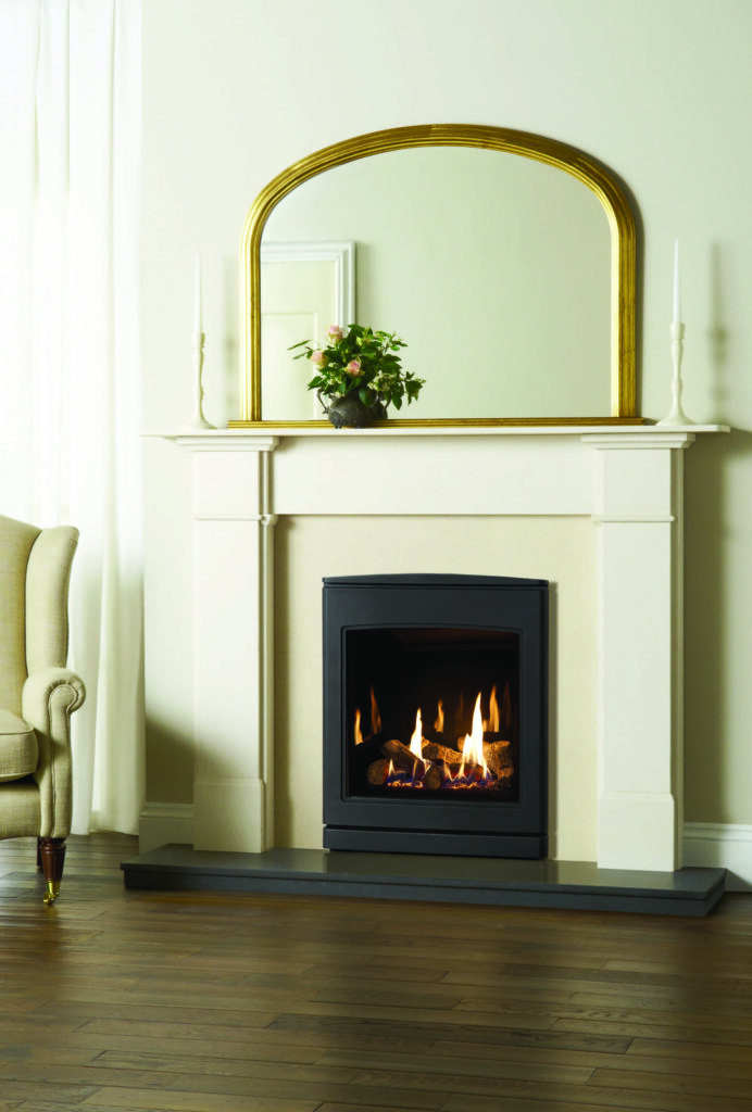 The robust cast iron fascia in a graphite finish will compliment any interior style and provides a beautiful frame to the large, portrait glass window. Available for both Natural Gas and LPG properties.